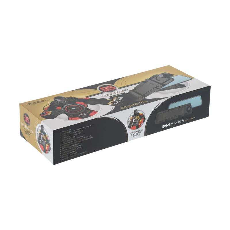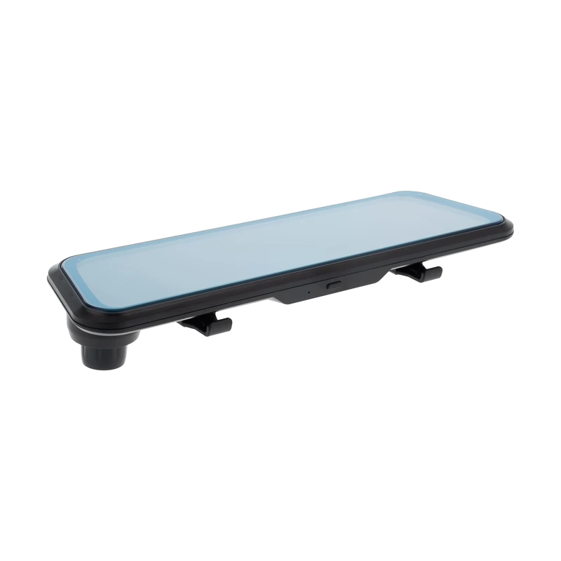 دوربین ثبت وقایع صدای نفس مدل BS-SMD-1OA از طراحی خاصی بهره میبرد که آن را برای نصب مستقیم بر روی آینه وسط خودرو مناسب کرده است. این سبک طراحی که به شکل «آینه هوشمند» نیز شناخته میشود، هم در زیبایی فضای داخلی خودرو تأثیرگذار است و هم از اشغال فضای اضافی جلوگیری میکند. ابعاد کلی آن ۲۵x۷x۵ سانتیمتر است و اگرچه ممکن است در مقایسه با برخی دوربینهای دیگر بزرگتر به نظر برسد، اما طراحی کشیده و نازک آن موجب میشود کاملاً با ظاهر آینه معمولی همخوانی داشته باشد. وزن دستگاه نیز ۳۱۰ گرم است که اگرچه نسبت به برخی مدلهای سبکتر اندکی بیشتر است، اما در هنگام نصب به هیچوجه ایجاد سنگینی یا لغزش نمیکند.