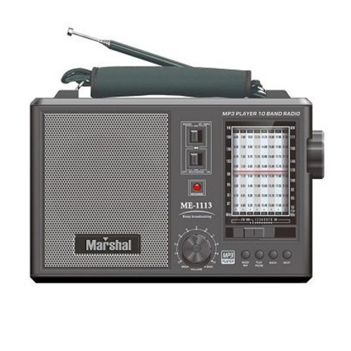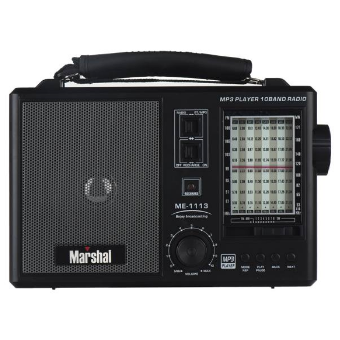 نسل جدیدی از رادیو های حرفه ای مارشال مدل با Me-1113 دارای پورت USB / SD و هم چنین امکان بلوتوث میباشد رادیو مارشال با قابلیت کار کردن با برق و باطری و شارژ داخلی یکی از محبوبترین محصولات شرکت مارشال می باشد.
